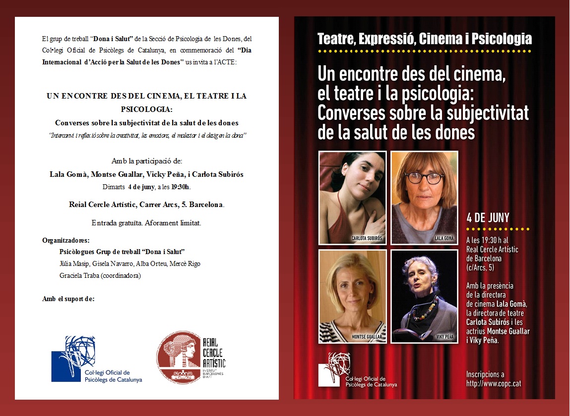 El acto «Un encontre des del cinema, el teatre i la psicología. Converses sobre la subjectivitat de la Salut de les Dones» fue un encuentro entre el mundo de la creación artística y la psicología, en relación a la salud de las mujeres, y un lugar de intercambio entre las diferentes miradas y discursos de las profesionales sobre este tema. En este encuentro se reflexionó sobre la forma en que la mujer vive la enfermedad, desde una mirada vital, donde a través del proceso de enfermedad siguen apareciendo proyectos, ilusiones…, es decir, escuchando sus propios deseos y siendo libres de como vivir su enfermedad.